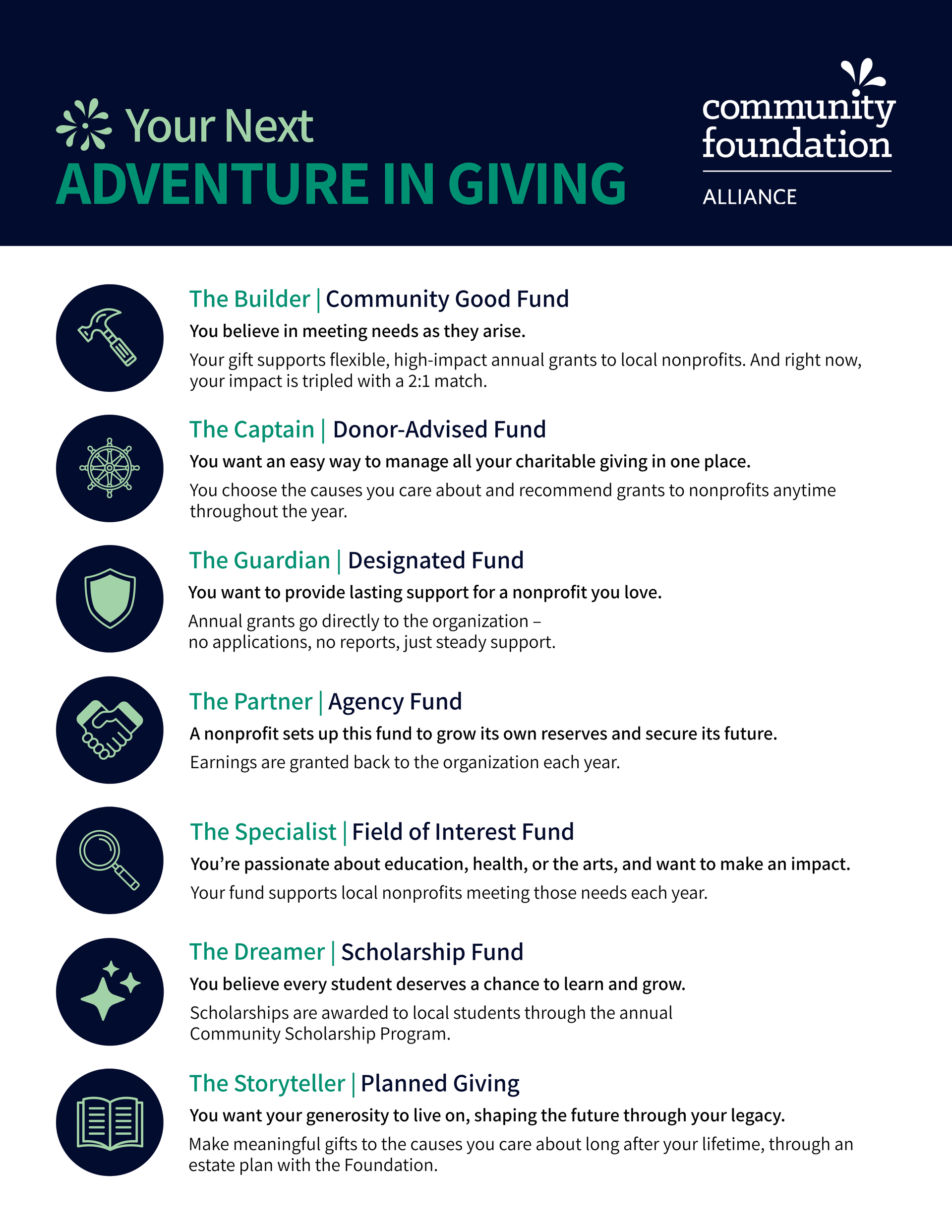 Estate planning isn’t just for the wealthy or elderly; it’s for anyone who wants to make sure their wishes are honored, and their loved ones are protected. Myth 1: Estate planning is only for the wealthy. Truth: Everyone has assets, your home, retirement, and personal possessions. Estate planning ensures that your wishes for your assets are carried out, providing security and peace of mind for you and your loved ones. Myth 2: It’s just about money. Truth: Estate planning also covers healthcare decisions, guardianship, and leaving a legacy for causes that are important to you. Myth 3: I can do it later. Truth: Life changes fast. A plan today protects your family and allows you to make decisions while you’re fully in control. Myth 4: It’s complicated and expensive. Truth: It can be simple. A modest plan or a gift through a community foundation can make a huge difference. Myth 5: My will is enough. Truth: Wills are just one tool. Trusts, beneficiary designations, and charitable plans help you leave a lasting and uncomplicated impact. Your legacy can make a difference in your community. A small portion of your estate can create a lasting impact through the Community Foundation Alliance.